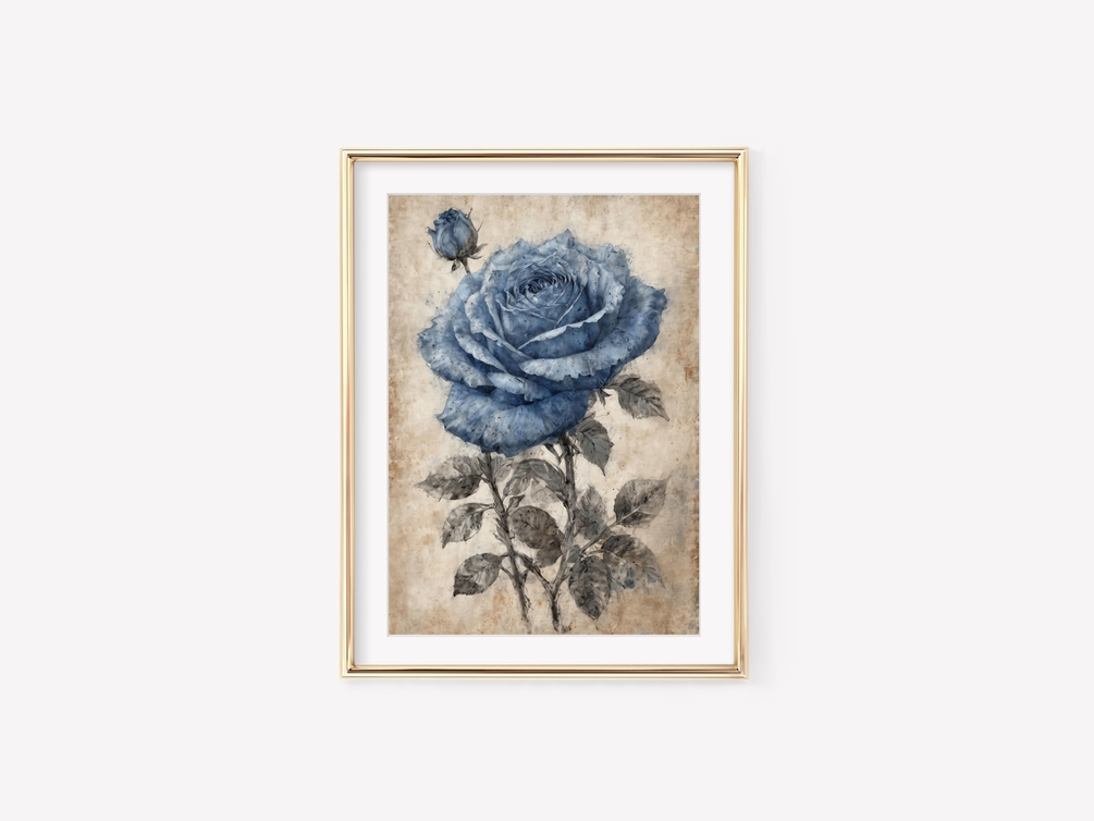 Do you yearn for a touch of timeless elegance with a hint of the extraordinary? This captivating digital print whispers tales of bygone eras, featuring a single blue rose sketched with delicate precision.